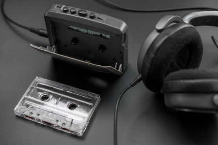 A cassette tape sits alongside an open cassette player and a pair of headphones. The dark background highlights the nostalgic audio equipment from the 1980s and 1990s.