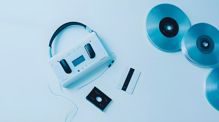 Retro cassette player with headphones, tapes, and large discs arranged on a light blue background.