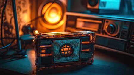 Cassette tape with an iconic s label resting on a table, with a classic stereo system and warm light filling the background.