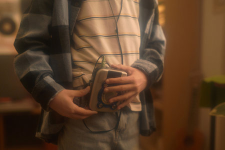 Close-up view of an unrecognizable kid holding retro cassette player while standing in cozy living room