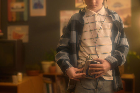 Unrecognizable kid standing in cozy living room, holding retro cassette player, wearing headphones and looking down at device