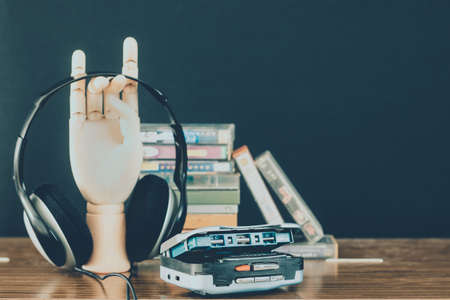 Vintage cassette player with earbuds and tape cassette.Retro style toned image. Selective focus