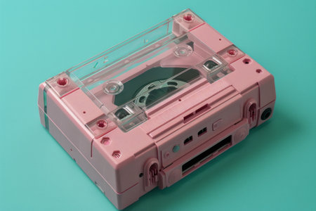 A pink handheld portable player against a turquoise backdrop exudes '90s flair