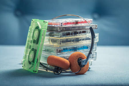 Classic stack of audio cassettes with orange headphones on blue sofa