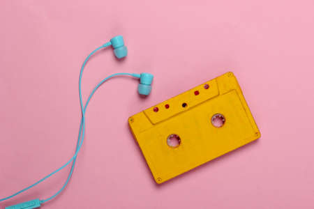 Retro audio cassette with earphones on pink pastel background. 80s. Top view. Minimalism.