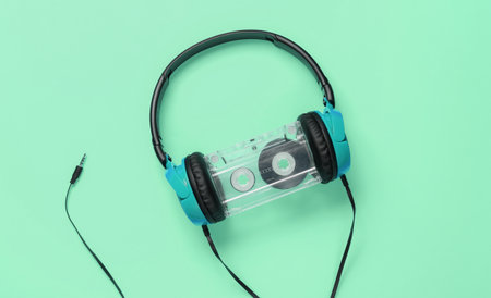Wired headphones with audio cassette on green background. Retro style, DJ. Top view, minimalistic music concept.