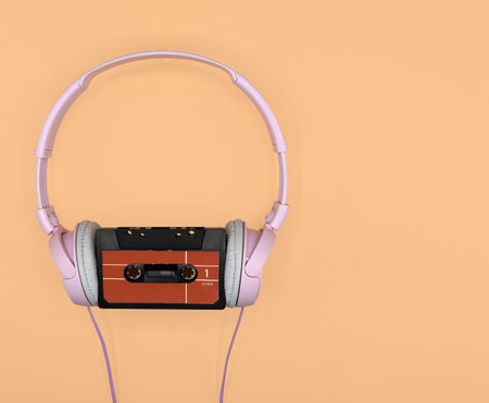 A retro cassette tape with earphones isolated on a peach color background