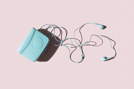 top view audio cassete tape and earphones pastel blue and pink gradient toned flat lay
