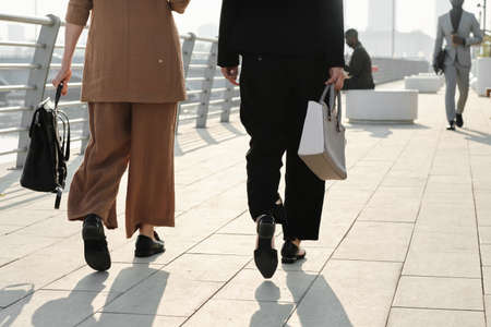 Horizontal back view shot of unrecognizable women wearing elegant formal clothes strolling down street somewhere in modern city
