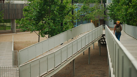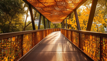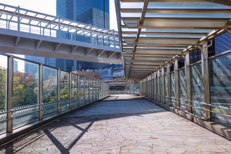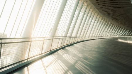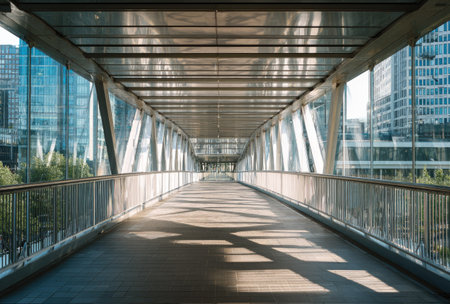 An elevated walkway with a glass and metal structure is depicted from a perspective view. The composition features linear elements, natural sunlight, and geometric forms. Suitable for illustrating architectural design concepts, urban planning, or conveying a sense of progression. It could be used in editorial pieces or for commercial purposes.
