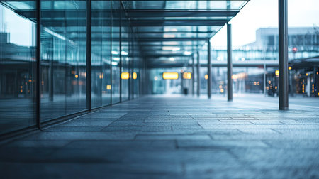 A captivating view of modern architecture featuring glass elements and a smooth pathway, creating a tranquil urban atmosphere. Ideal for showcasing contemporary design.