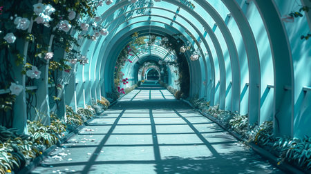 Aesthetic arched tunnel with red flowers and shadows in garden on sunny day. Romantic elegant background. Generative AI.