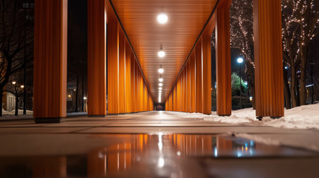 Nighttime view of a wooden corridor illuminated by warm lights near a snow-covered ground in an urban area
