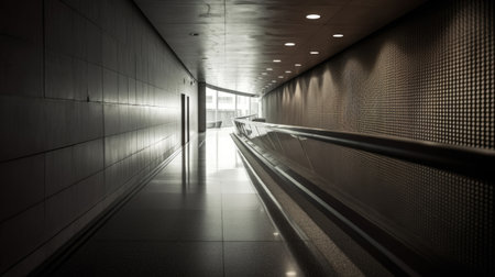Empty futuristic tunnel with moving walkway and bright lights.