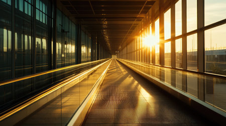 A long, empty corridor lined with moving walkways, softly lit by sunlight streaming in from tall glass walls.