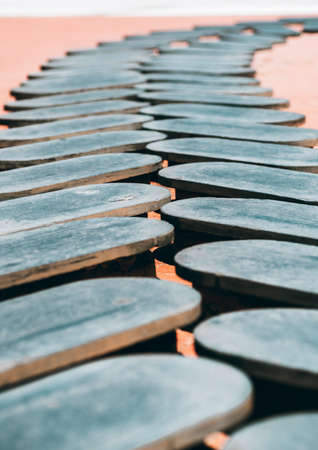 Vertical shot with a shallow depth of field of a long pathway over the sandy ground made of two rows of wooden platforms angled to each other, sunny day, selective focus in the middle