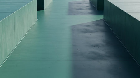 A modern architectural pathway curves into the distance, bathed in a cool teal light. Dramatic shadows cast by unseen structures create a striking contrast across the smooth concrete surfaces. The clean lines and minimalist evoke a sense of calm and futuristic elegance. captures the interplay of light and form within a contemporary architectural space, highlighting its geometric beauty and serene atmosphere. The perspective draws the viewer into the scene, emphasizing the vastness and clean