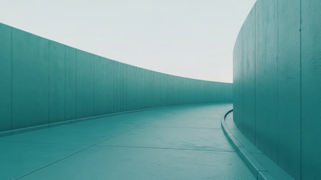 A modern and minimalist architectural scene a smoothly curved pathway made of turquoise concrete, bordered by a matching turquoise concrete wall. The pathway recedes into the distance, creating a strong sense of perspective and leading the viewer's eye. The wall follows the curve of the path, creating a sense of enclosure and direction. The sky above is a pale, almost white hue, providing a stark contrast to the vibrant turquoise. The overall impression is one of serene tranquility and...