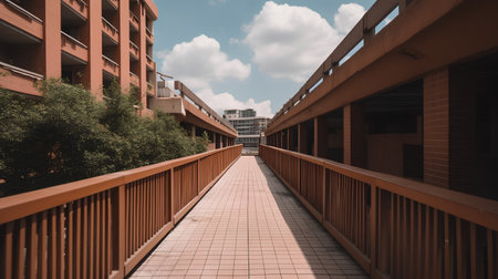 This image showcases a modern enclosed pedestrian bridge, featuring a symmetrical composition. The structure uses wood and glass. The lighting is bright and even, casting soft reflections. The design could be suitable for architecture, transportation or urban environment illustration.