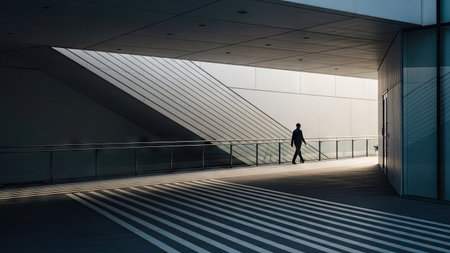 A person is seen walking in silhouette through a contemporary architectural structure. The scene is illuminated by strong sunlight creating dramatic shadows and highlighting the linear patterns of the building. This image showcases a modern aesthetic, suitable for various editorial and commercial applications.