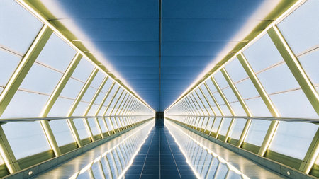 A modern, symmetrical tunnel with mirrored floor and lit windows