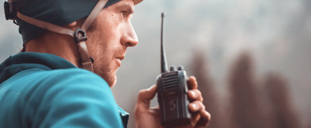 A mountain rescuer, man with a walkie-talkie.
