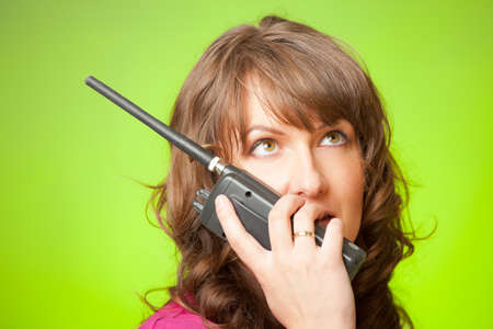 Beautiful woman talking on the walkie-talkie over green background