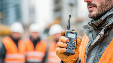 A man in safety gear communicates with his team through a walkie-talkie while working on a construction site surrounded by blurred colleagues in hard hats