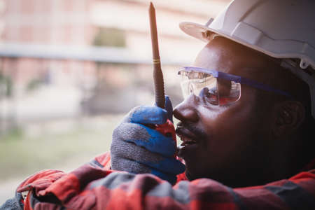 African man engineering controller checking, working with walk radio communication or walkie-talkie in room system in industry