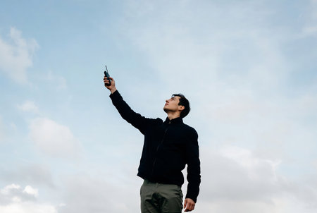 A young man with a radio transmitter in his hand against the sky.