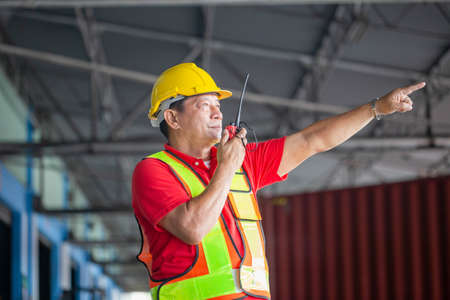 Foreman using radio walkie talkie control loading containers box in cargo for import export, Professional engineer work checking loading containers box.