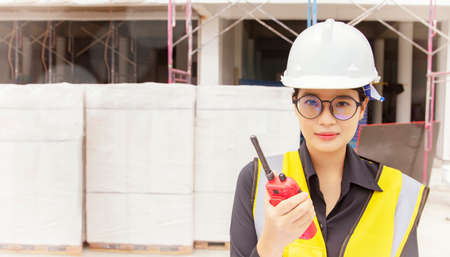 Portrait of young Asian female engineer holding walkie talkie on construction site