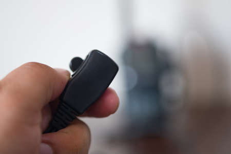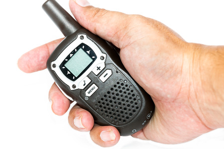 Tangent of radio station in man hand on white background. Walkie-talkie or radio transmitter