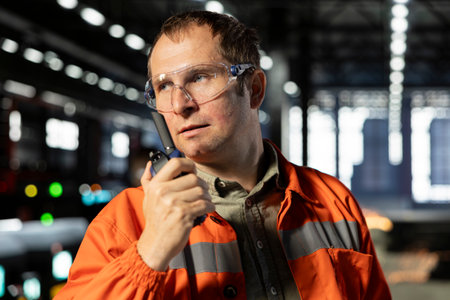 Employee speaking through walkie talkie radio to oversee machinery operation, demonstrating manpower and the professional responsibility in manufacturing process for production.