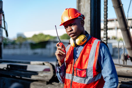 Black male african american engineering in uniform walkie talkie checking containers loading. Area logistics import export and shipping.