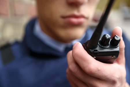 A security guard uses a walkie talkie to maintain safety and communication. Concept Security Guards, Walkie Talkies, Safety Communication, Security Protocols, Emergency Procedures