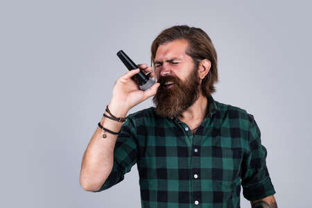 male singer with mic. concept of karaoke. man singer love music. brutal man sing with microphone. vocal school. brutal and rock. bearded man wear checkered shirt singing song