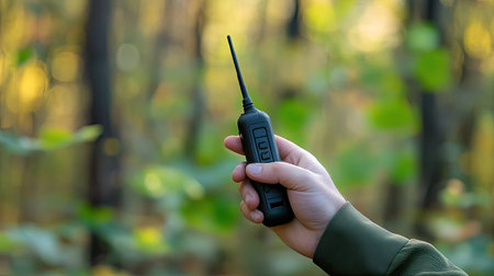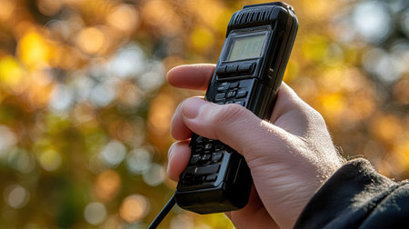 A hand holding a walkie-talkie, thumb pressing the talk button, with a blurred background for focus on the device, emphasizing communication.