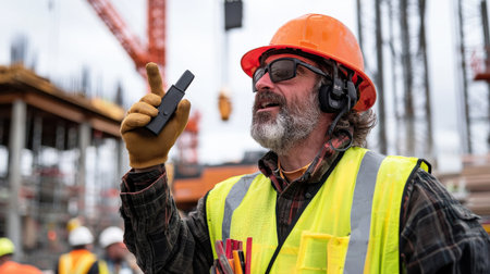 A construction supervisor with a walkie-talkie giving directions at a busy construction site