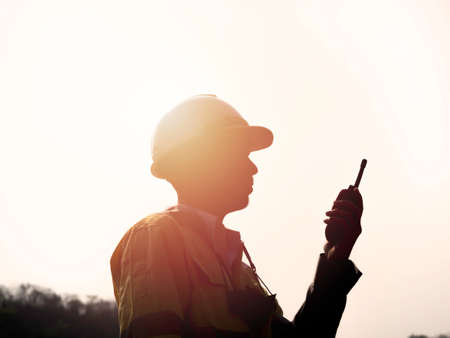 Silhouette side view of young Asian engineering man wearing yellow high visibility safety jacket and white safety helmet or hard hat using walkie talkie on sunset background.