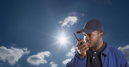 Digital composite of Security guard using radio against sky