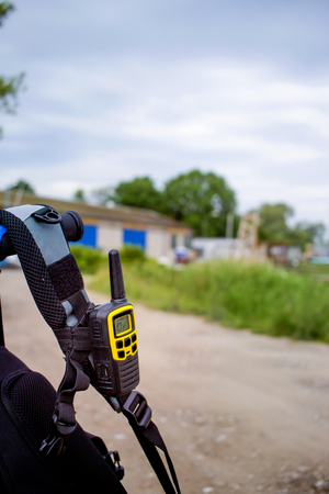 Pair of portable radio sets on the background of a military backpack camouflage modern army radio