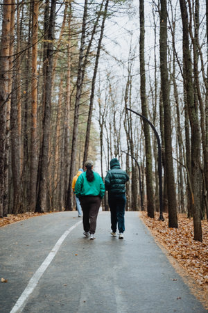 Legs of people engaged in fitness walking, on a walking wooden walkway