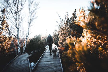 Woman walking dog on wooden pathway in the woods during cold spring on Sumava, Czech republic