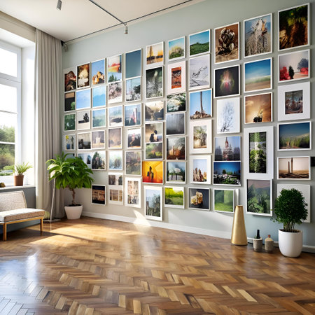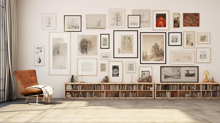 a gallery wall with a mix of framed photos and art pieces, created with generative ai