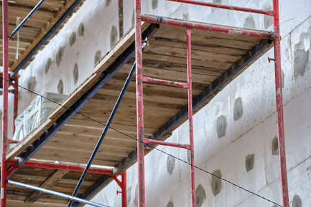 Building facade under renovation works with construction scaffolding frame. Wall insulation with styrofoam sheets for energy efficient home