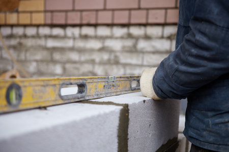 bricklayer builder using the water level, check the inclination of autoclaved aerated concrete blocks. Walling, installing bricks on construction site