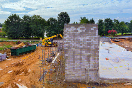 Scaffolding construction site with block wall is being mounted by a mason man masonry cinder concrete blocks being laid
