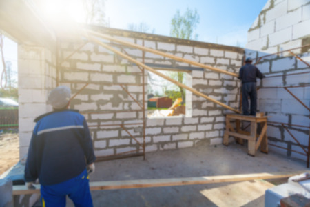 Blurred building is under construction with roofing and the materials for construction and workers. Blurred background of construction concept with bokeh effect