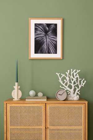 Stylish interior of living room with mock up poster frame, wooden commode, book, eucalyptus leaf in ceramic vase and elegant personal accessories. Minimalist concept of home decor. Template.